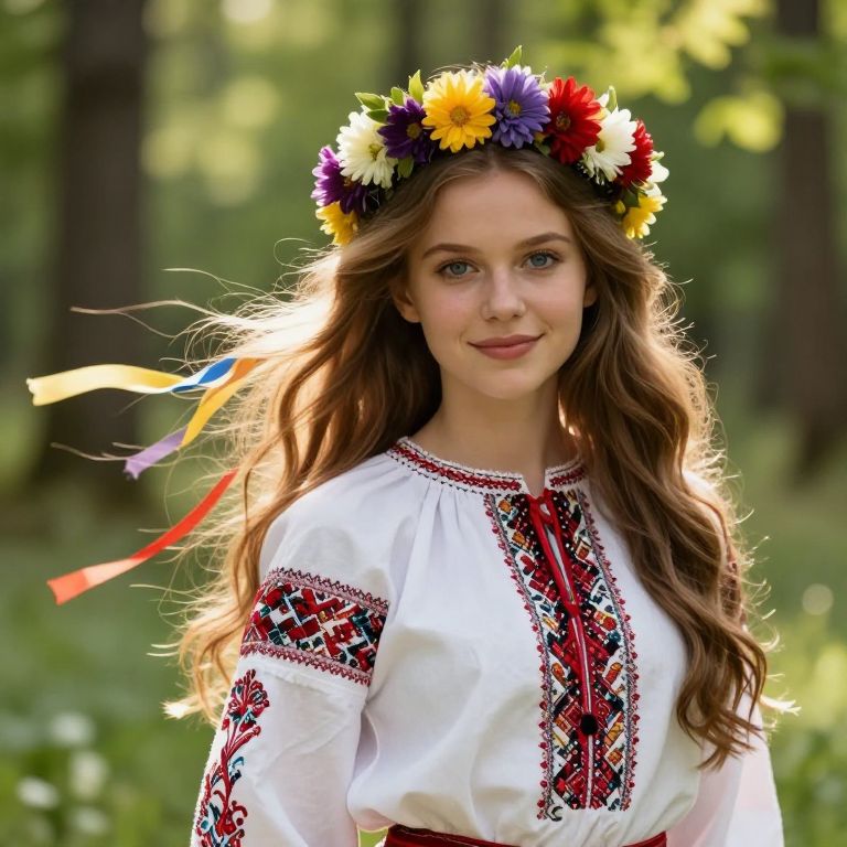 A stunning Slavic girl with long, flowing light brown hair and deep blue eyes stands in a picturesque forest clearing, She wears a traditional embroidered white blouse with red and gold patterns and a bright flower crown on her head, decorated with ribbons fluttering in the wind, Her serene smile reflects warmth and grace, The background is a lush green forest with soft sunlight filtering through the trees, creating a magical atmosphere, The style is very detailed and realistic, capturing the textures of the fabric, the natural beauty of her features and the play of light and shadow