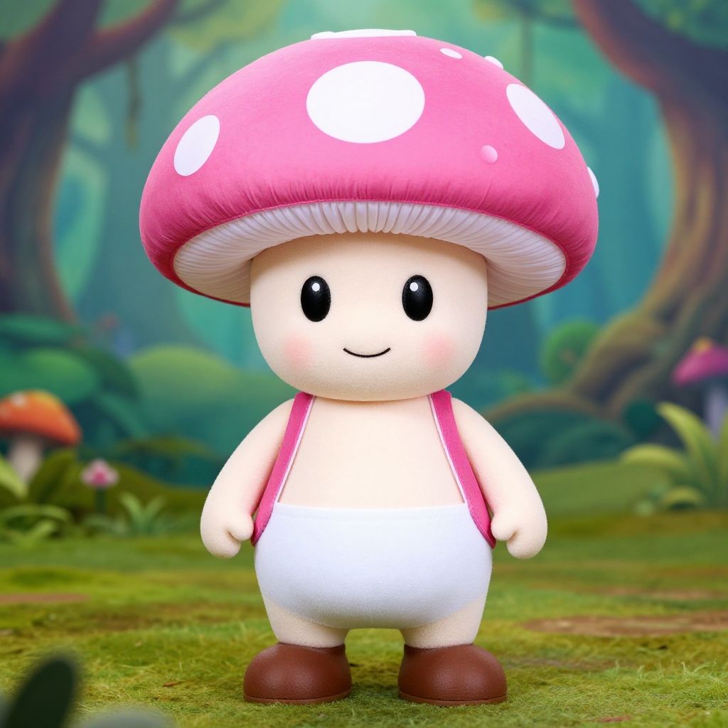Toadette costume adult, vibrant and detailed, featuring a playful pink mushroom cap with white spots, whimsical and cartoonish style, set in a colorful fantasy forest background, soft lighting highlighting the fabric textures, full body portrait.