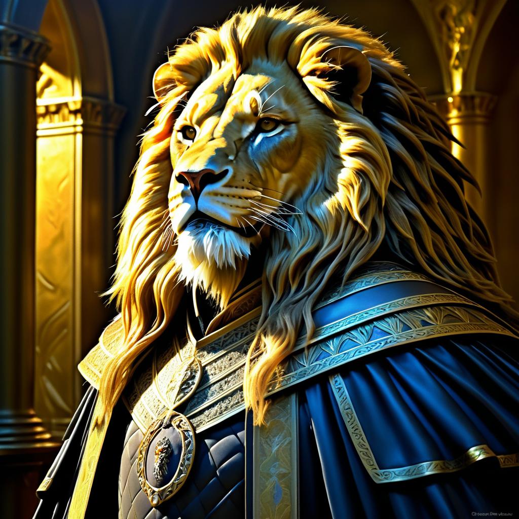 Portrait of a noble lion as a king, dramatic lighting, cinematic, ultra-realistic, styled by Brian Froud, Donato Giancola.