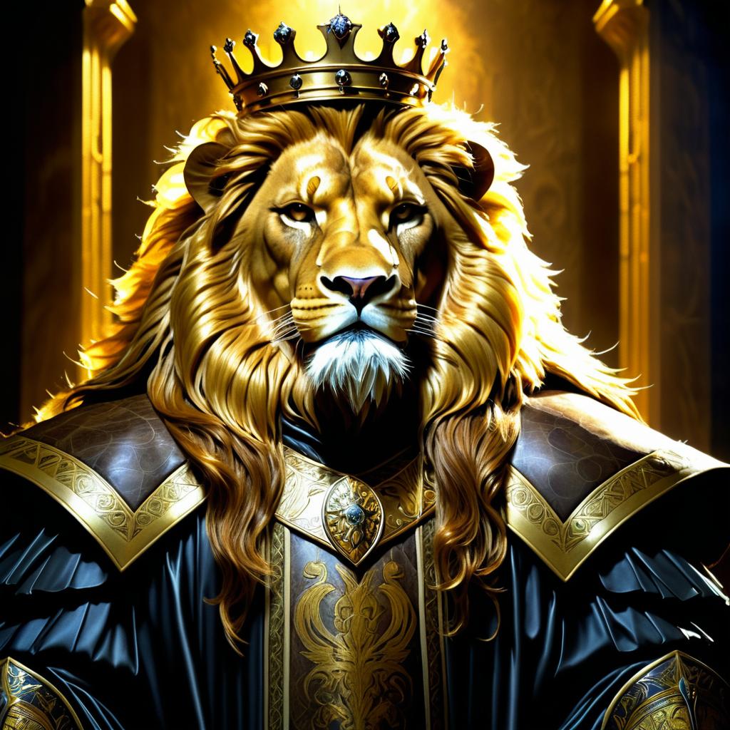 Ultra-realistic portrait of a noble lion depicted as a king, featuring dramatic cinematic lighting. The lion wears a golden crown and intricate gold and black royal armor, showcasing detailed textures and an expressive majestic gaze. The artwork is styled reminiscent of fantasy artists Brian Froud and Donato Giancola.
