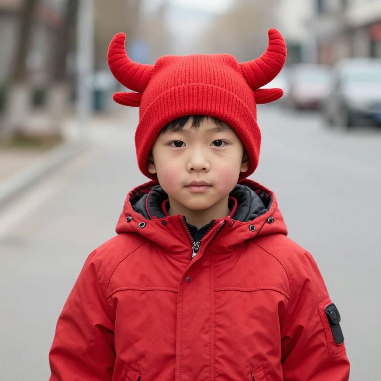 Boy wearing a red winter coat with a black collar and a red hat with horns on the top.