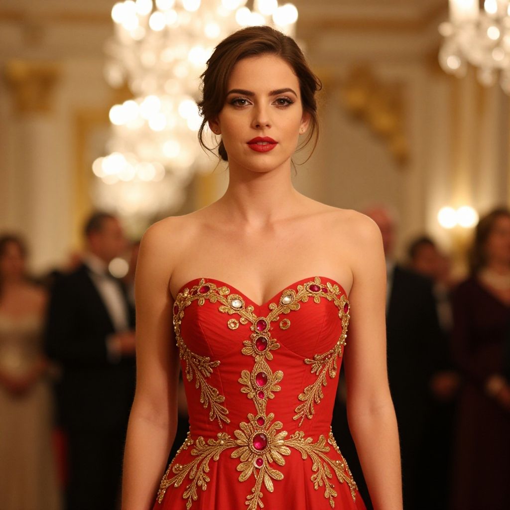 A woman with long dark hair is wearing a white and red dress with a heart pattern on the front. She has a crown on her head and is standing in a room with other people in the background.