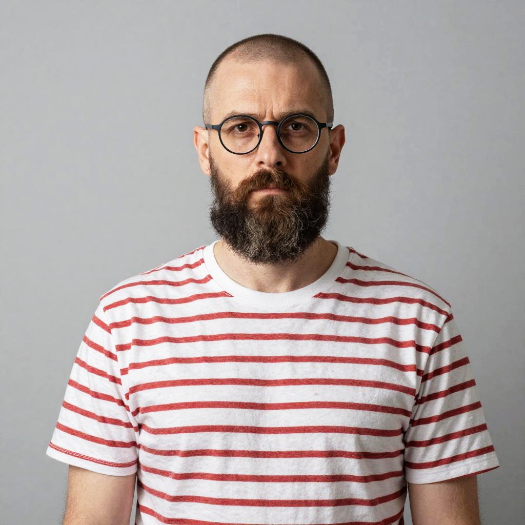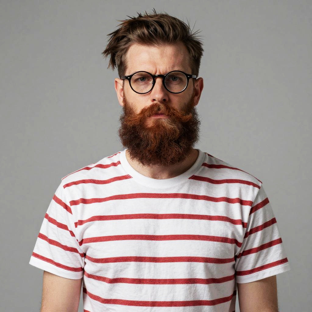 Bearded lumberjack drawn like a logo, with full beard, shaggy hair, White cotton t-shirt with horizontal red stripes very regular and 1cm large, round glasses, high quality, detailed design, minimalistic, professional lighting, cool tones, minimalist style, highres, detailed facial hair, mature, sophisticated, cool tones, minimalistic, focused lighting