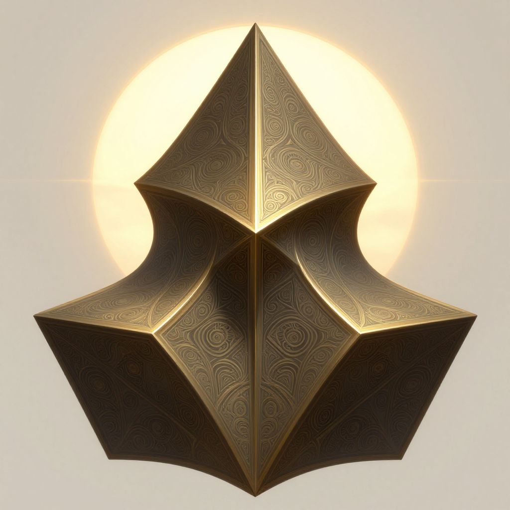 This is a digital rendering of a gold-colored, three-dimensional, geometrically intricate object resembling a stylized star or hexagram. The object features six pointed, triangular facets with ornate, swirling patterns embossed on each surface. The central points converge to a sharp apex, forming a symmetrical, star-like shape. A bright, glowing circular halo surrounds the object, creating a halo effect that contrasts with the dark, matte gold texture of the object itself. The background is a simple, gradient white-to-gray, ensuring the object is the focal point. The overall style is a blend of modern digital art and traditional ornamental design.