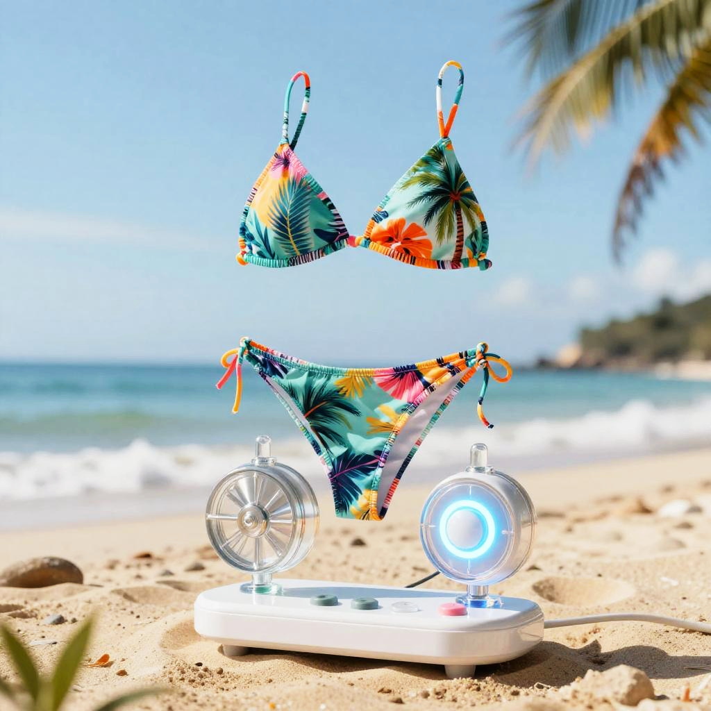 Creative bikini generator device with spinning reels of fabric patterns, vibrant tropical prints flying through the air, sunny beach atmosphere with sand and surf, stylized modern design with clear glass components and glowing buttons, imaginative and playful tone