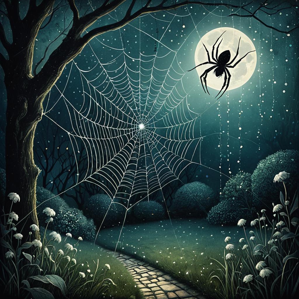 A surreal and dreamlike scene featuring an enchanting spinner spider weaving a luminescent web in a mystical night garden. The garden is illuminated by calm moonlight with dew droplets on delicate spider threads, surrounded by soft pastel tones and whimsical, glowing foliage.