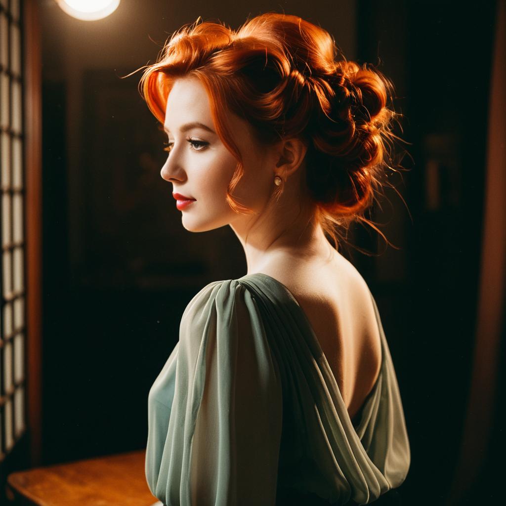 Romantic Updo hairstyle on redhead woman, wearing silk chiffon gown, in vintage photo studio, captured in fashion editorial style with warm ambient lighting.