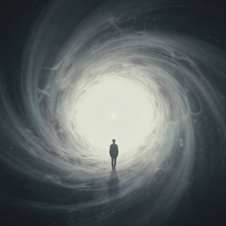 Digital artwork depicting a silhouetted figure standing at the center of a swirling, luminous vortex in space. The figure, wearing a hat and coat, is positioned at the bottom center, facing the bright white light at the vortex's core. Surrounding the figure, the vortex swirls with ethereal, cloudy textures in shades of blue, white, and gray, resembling a cosmic tunnel. The background is a dark, star-speckled space, enhancing the contrast with the vortex's brightness. The style is surreal and abstract, creating a sense of depth and motion.