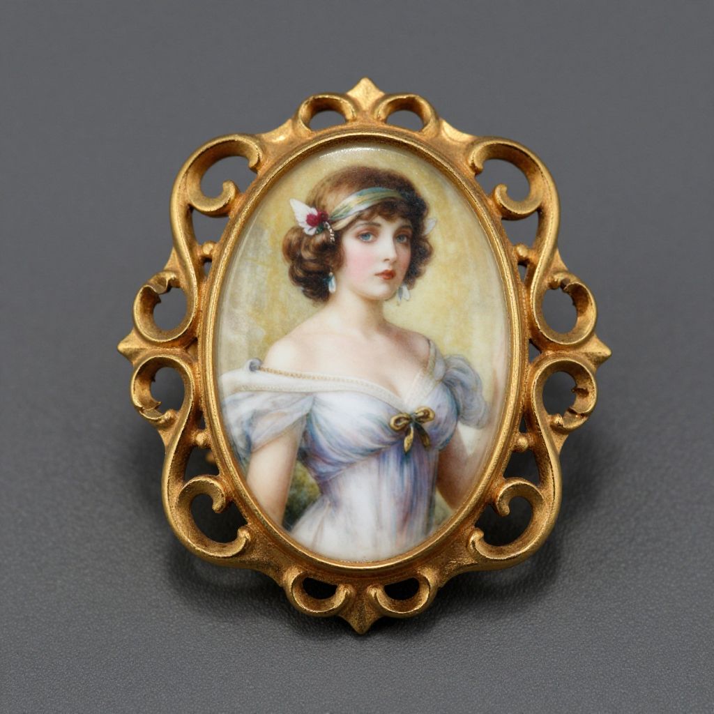 An Art Nouveau brooch, crafted in scrolled gold and hand-painted porcelain, encapsulates the timeless elegance of a bygone era, evoking a serene yet nostalgic longing for the grace and mystery of the early 20th century.