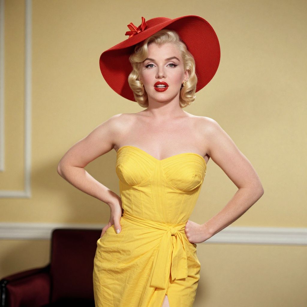 Marilyn Monroe Costume, blonde woman in yellow dress and red hat posing for a picture