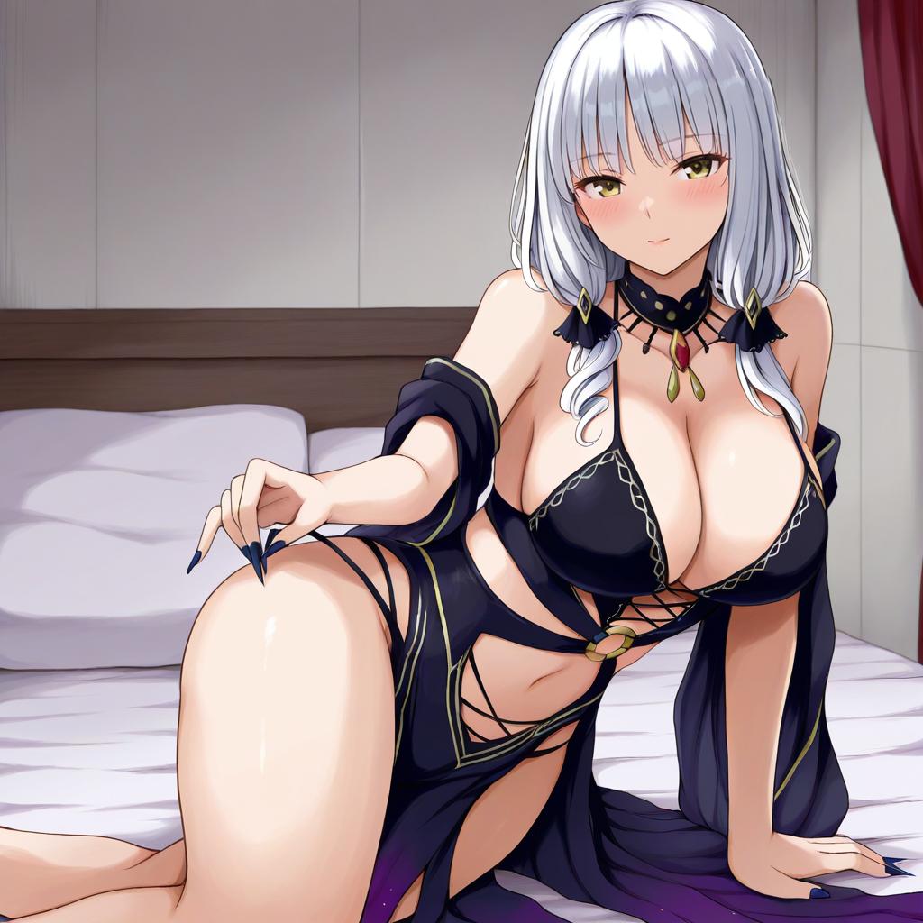 Carmilla (fate), fate (series), 1girl, yellow eyes, long hair, white hair, curly hair, grey hair, large breasts, cleavage, thighs, navel, bare shoulders, nail polish, long fingernails, by artist yuuji (yukimimi), leet