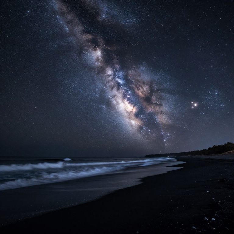 Under a celestial tapestry where the Milky Way cascades like liquid light, waves of the cosmic sea lap against shores of deep black sand, mirroring a universe that dances between reality and dreams.