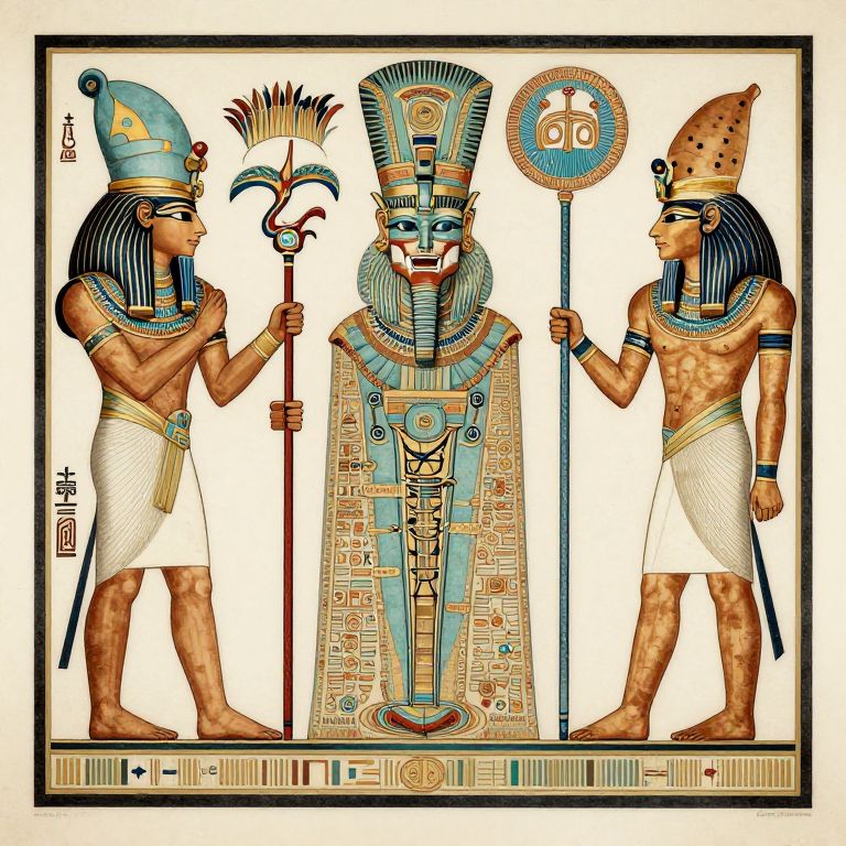 Ancient Egyptian illustration: Three pharaohs, adorned in colorful headdresses and white loincloths, holding staffs and a circular symbol,