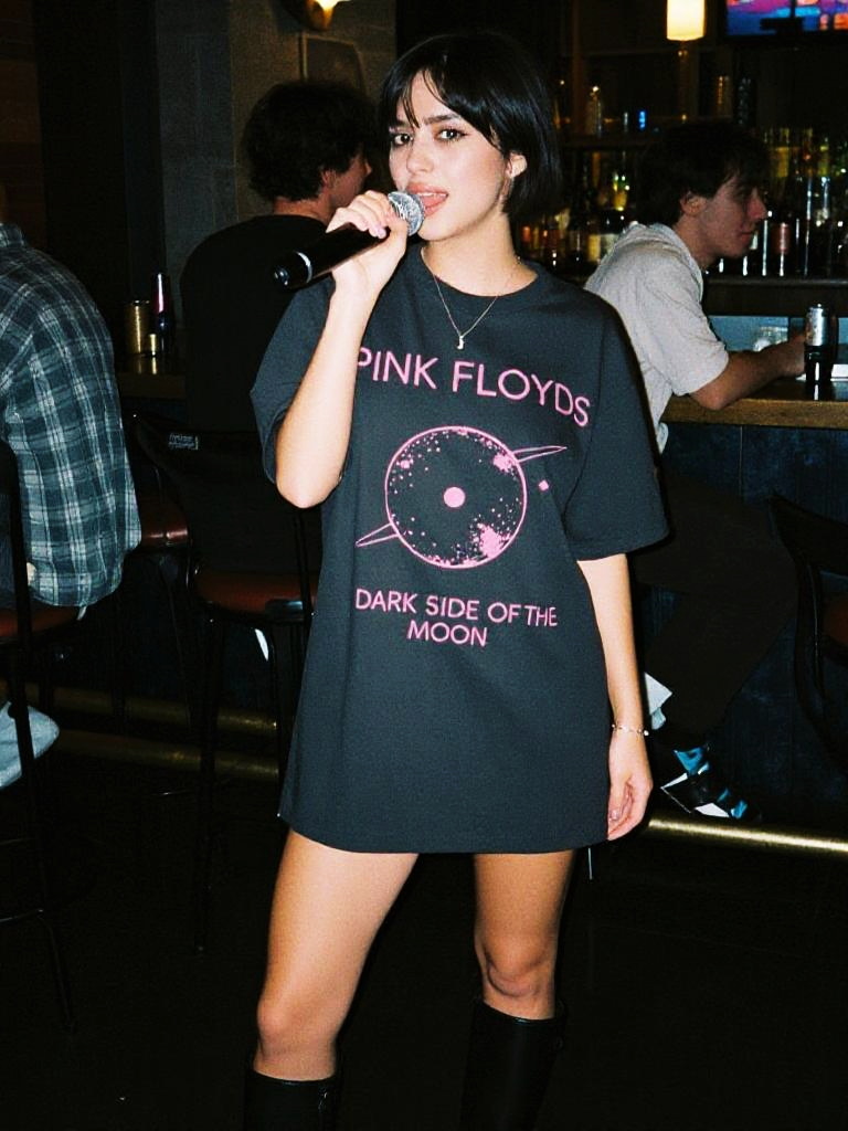 A woman in a casual rock oversized graphic t-shirt dress featuring Pink Floyd's Dark Side of the Moon album cover, paired with black ankle boots, minimal jewelry, enjoying a karaoke night at a cozy bar, captured in the style of 3M Ferrania analog film stock. Sexy. Pretty face and beаutiful eyes. Big breasts