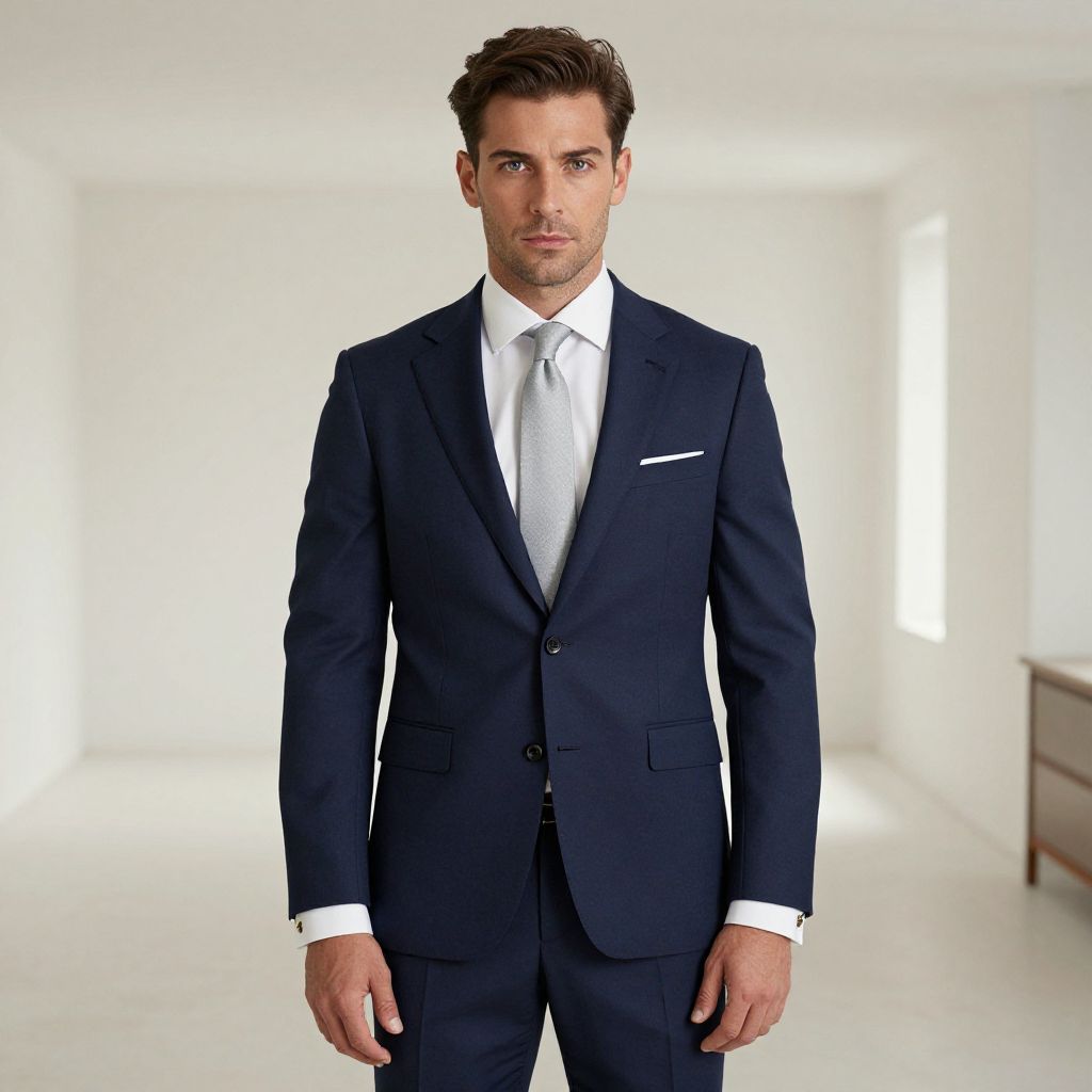 A man, navy blue slim fit suit, white cotton shirt, light gray tie, leather brogues, classic cufflinks, minimalist interior, bright open spaces, hand-tinted photograph, confident expression Man has masculine face and piercing eyes