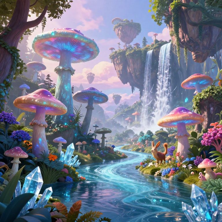 Whimsical digital painting: vibrant, glowing mushrooms, colorful crystals, lush forest, cascading waterfall, winding blue stream, rainbow-hued mushrooms,