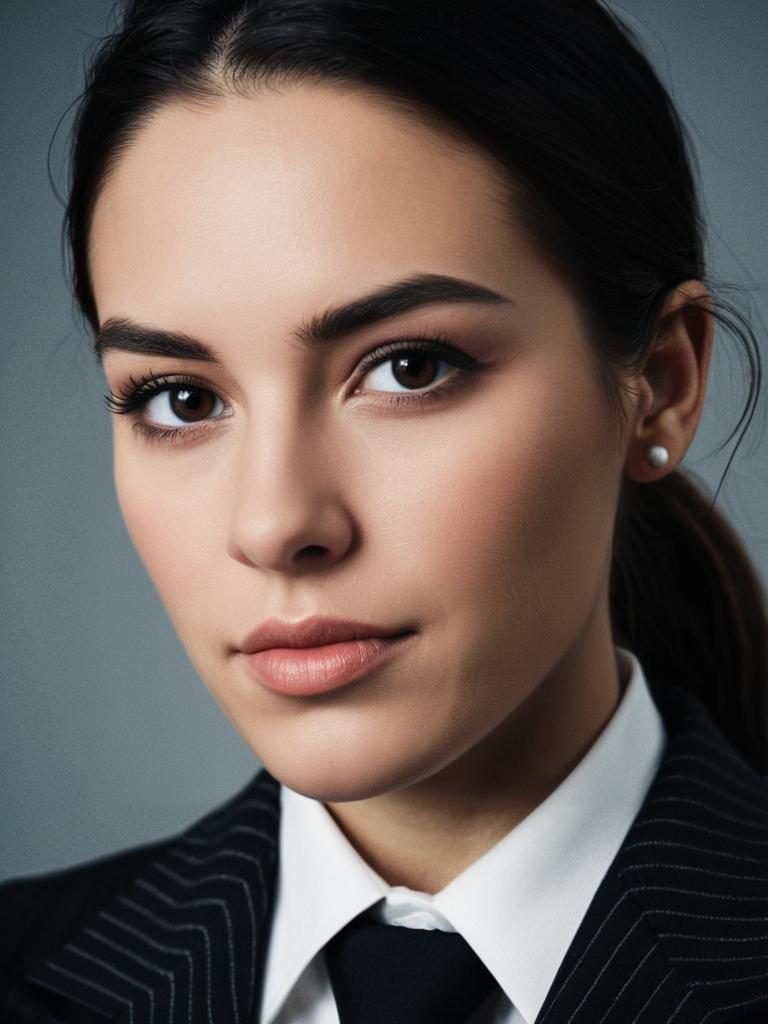 Woman in Formal Business Attire costume, photorealistic close-up headshot