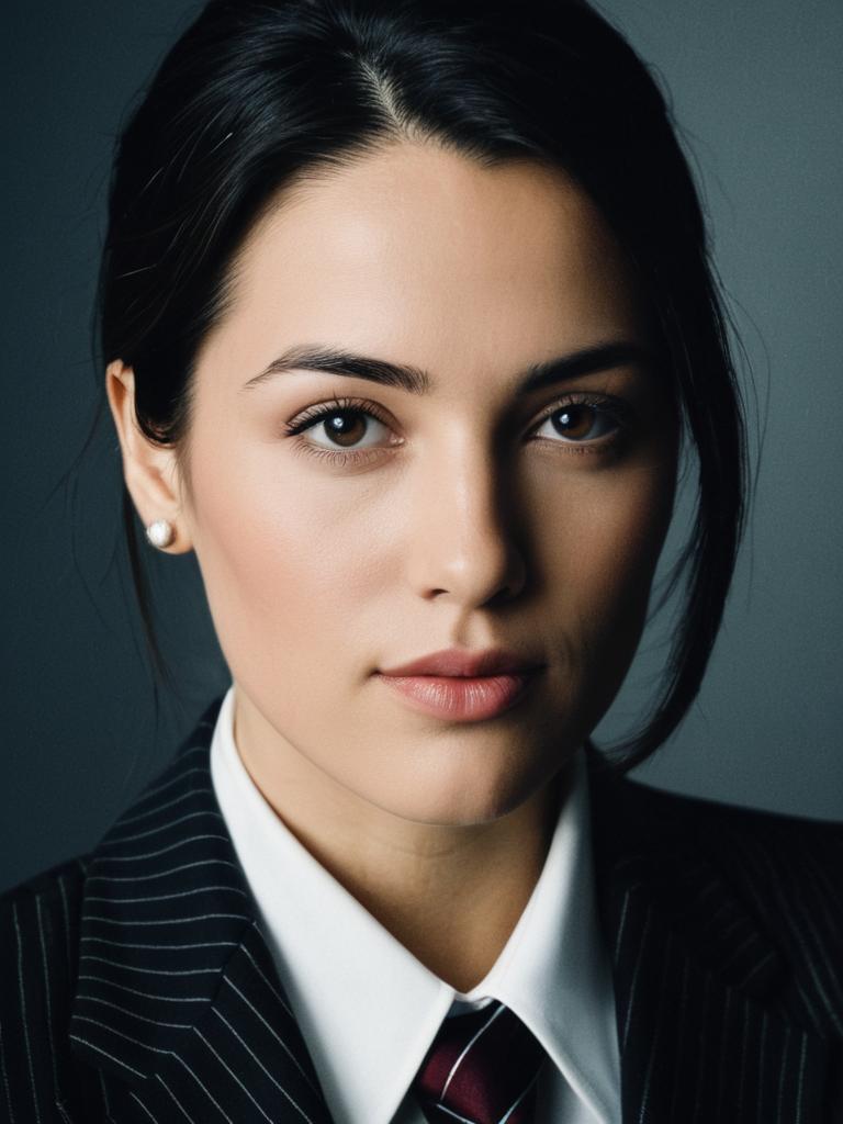 Close-up portrait of an elegant young woman wearing formal business attire including a white shirt, dark striped blazer, and a dark tie. She has short dark hair, clear skin, and a confident expression against a neutral background.