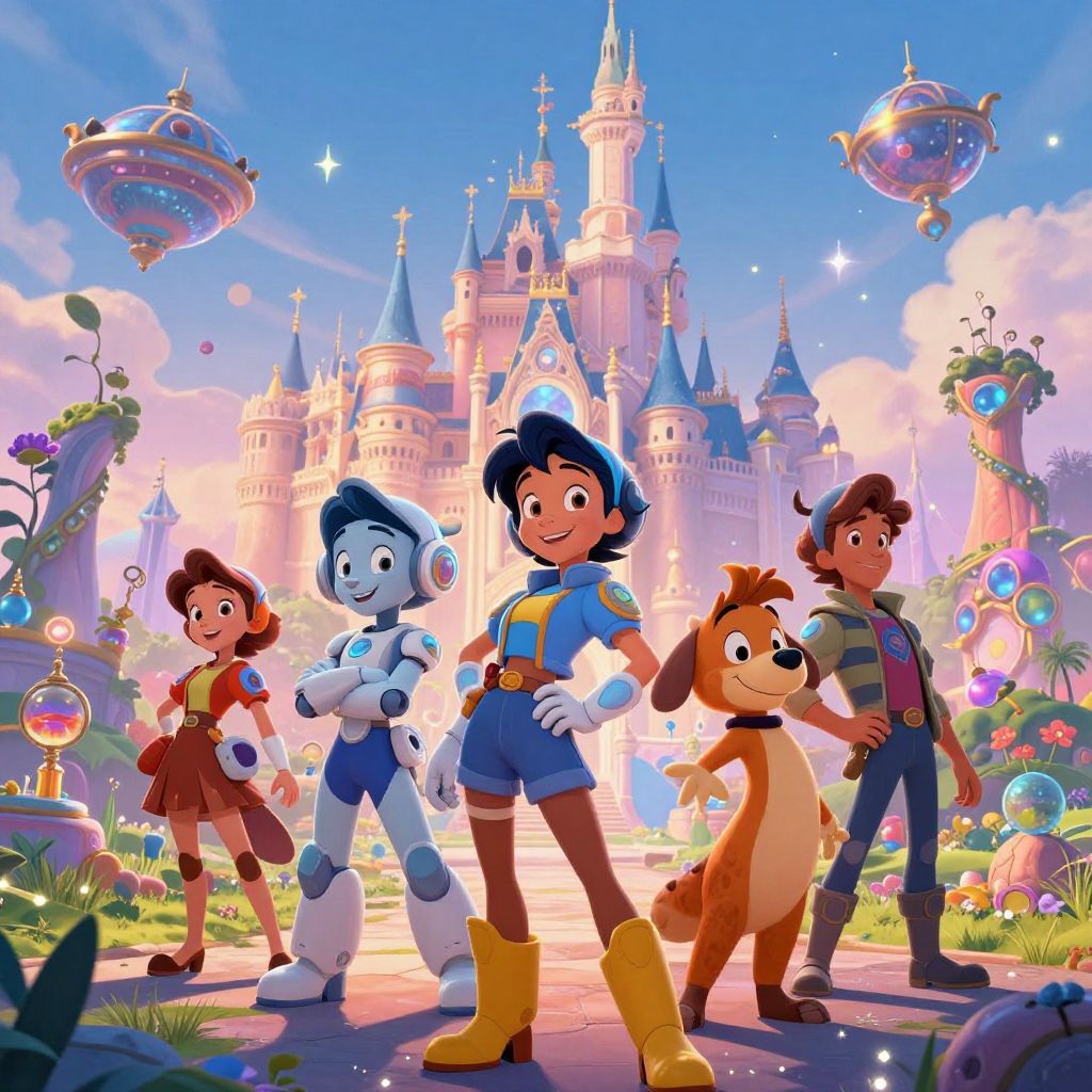 Create make Disney characters scenes filled with enchanting forests, fairy tale castles, and joyful creatures, blending hand-drawn aesthetics and soft pastel palettes, embodying innocence and adventure in a lively, storybook atmosphere.