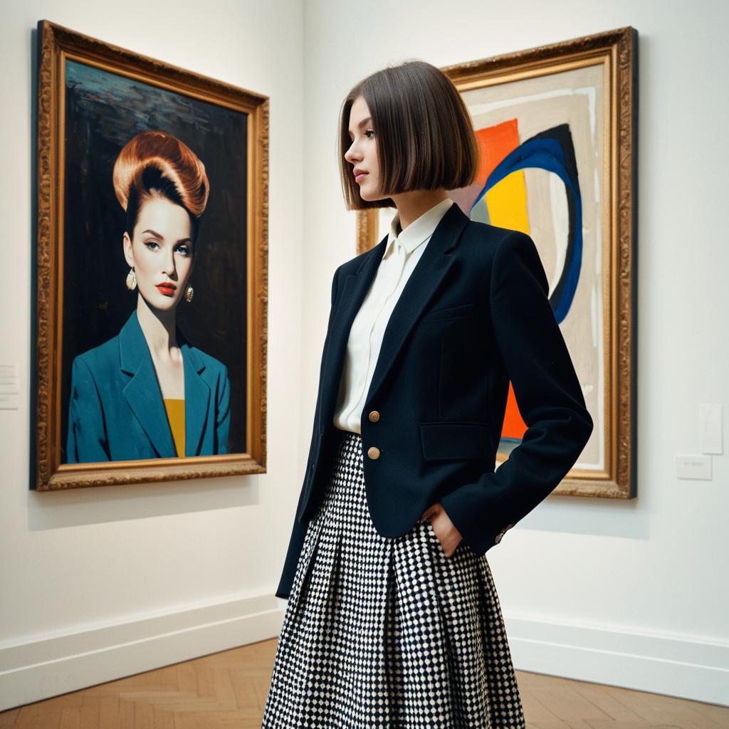 Blunt Cut hairstyle on fashion model, wearing vintage-inspired blazer and skirt, in art gallery with abstract paintings, captured in fashion editorial style with natural window light.