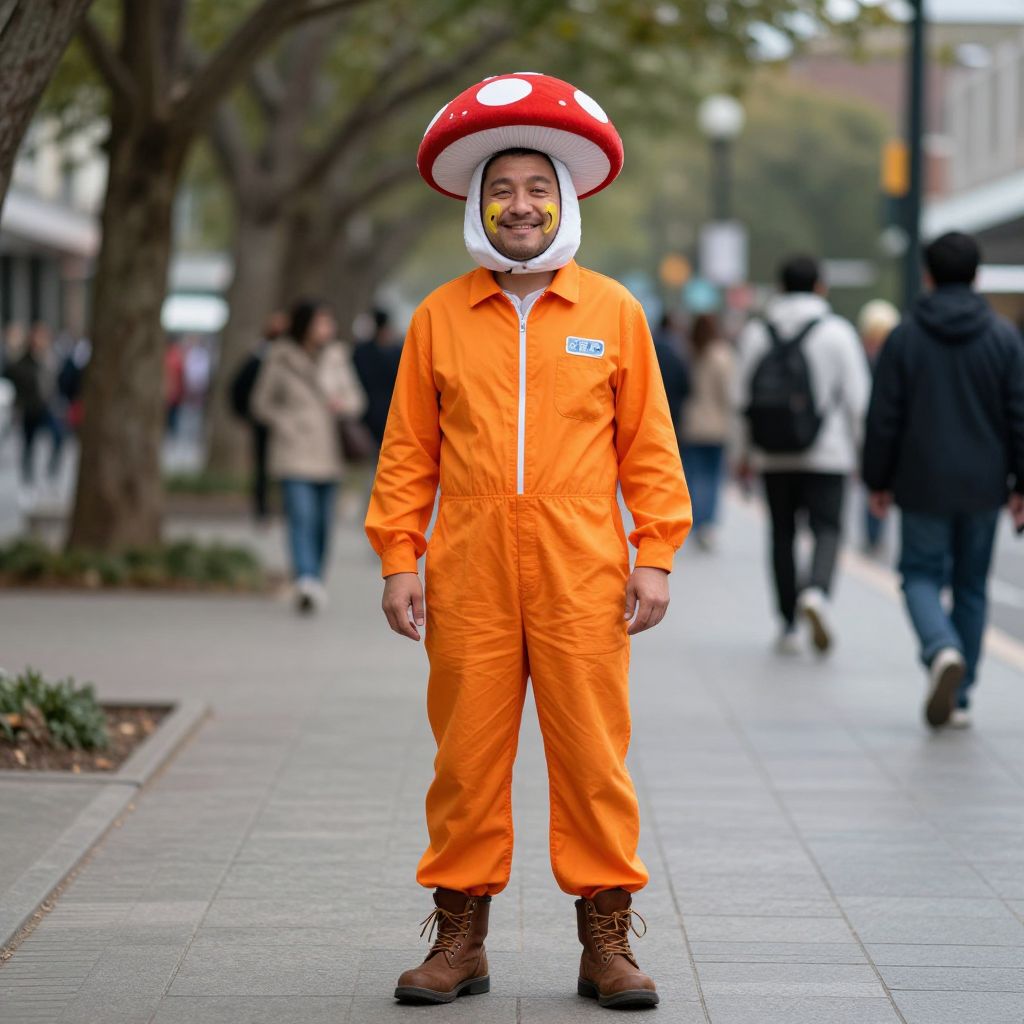 A man with a mushroom hat and orange jumpsuit is standing on a sidewalk. The man has a smiley face on his face and is wearing brown boots. The background is blurred, with trees and other people visible. He has a friendly, approachable demeanor, with a warm smile that radiates positivity. The scene is set in a bustling urban environment, with the blurred background capturing the essence of a lively street scene, including distant trees and passersby. The man's clothing is vibrant and eye-catching, making him the focal point of the image.