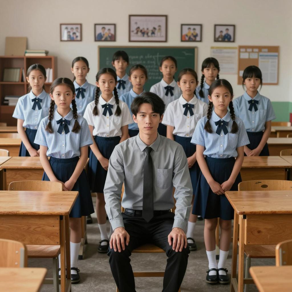 Photograph of a classroom with 12 young girls in blue-striped shirts and navy skirts, standing in rows. A male teacher in a gray shirt and black tie sits in the center. Girls have serious expressions, some with braids. Wooden furniture, framed pictures, and books on walls. Girls' hands clasped, teacher with hands on knees. Dimly lit room.
