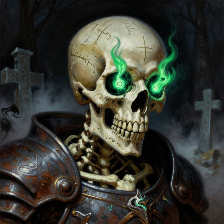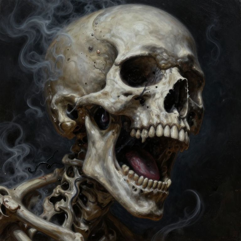 Highly detailed oil painting of a skeletal skull with a grotesque, open-mouthed scream, exuding dark, smoky tendrils, The skull, rendered in shades of gray and black, appears to be disintegrating and his eyes are glowing in agony, The background is a muted black, enhancing the horrifying and eerie atmosphere, The image is a close-up, capturing the skull from the side and below angle
