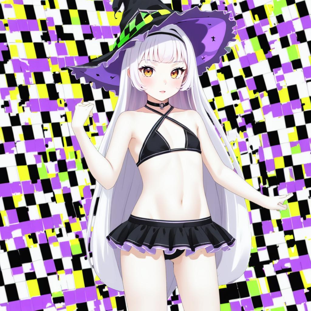 Digital anime-style drawing of a young girl with long white hair and amber eyes. She wears a black bikini top with crisscross straps, a short black frilled skirt, and a large, pointed, purple witch hat with a green buckle. The background features a chaotic, colorful checkerboard pattern with black, yellow, and purple squares. The girl stands confidently with a slight smile, her right hand raised in a fist. The art has a vibrant, energetic feel, with sharp contrasts and bold colors.