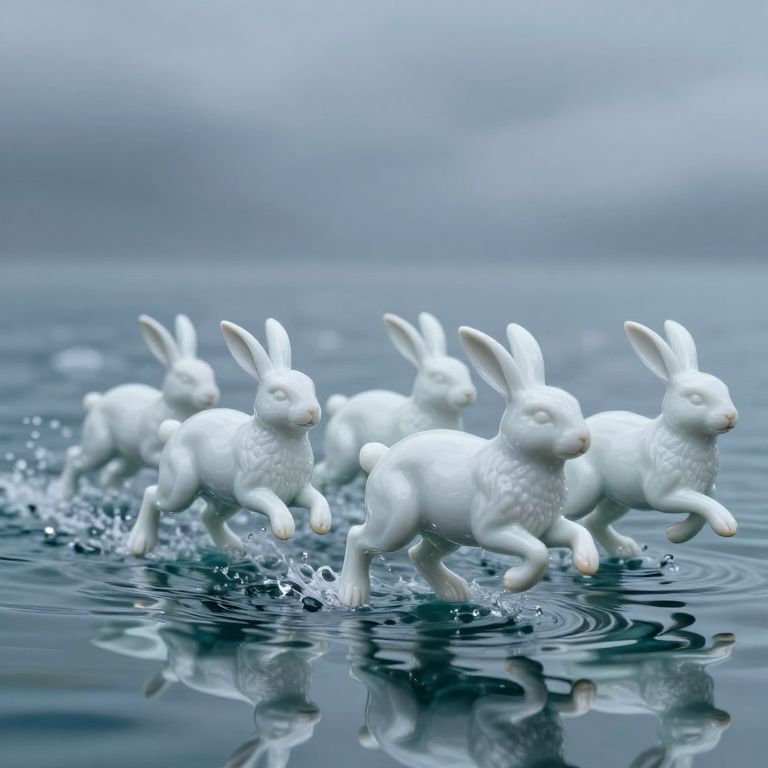 An ethereal procession of porcelain rabbits gallops across a mirrored ocean, their ceramic forms stirring ripples that awaken forgotten echoes in the depths, evoking a surreal dance between memory and eternity.