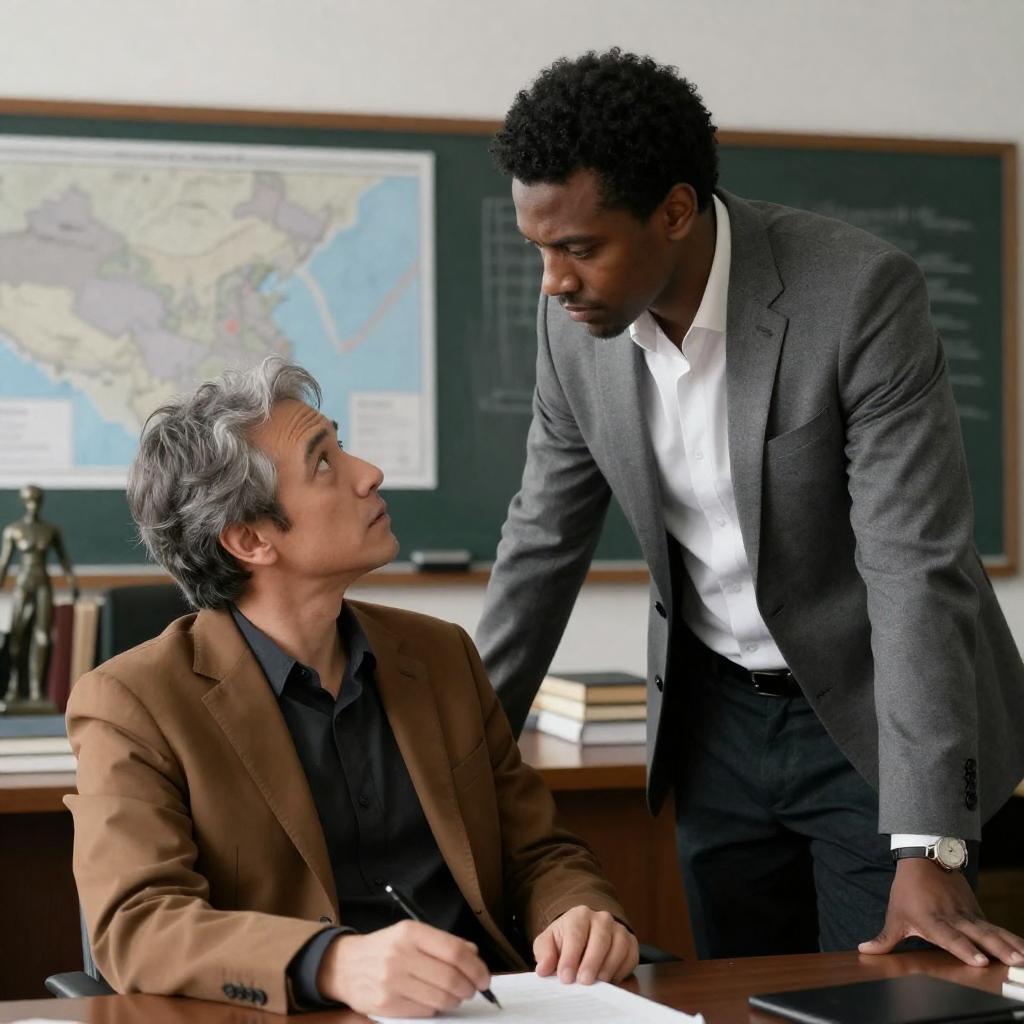 Photograph of a classroom. Black man in dark suit and tie stands left, looking down. Blonde woman in black dress and sandals sits on desk right, legs crossed, looking up. Shelves with books and a painting on wall. Window in background. Casual, intense interaction.
