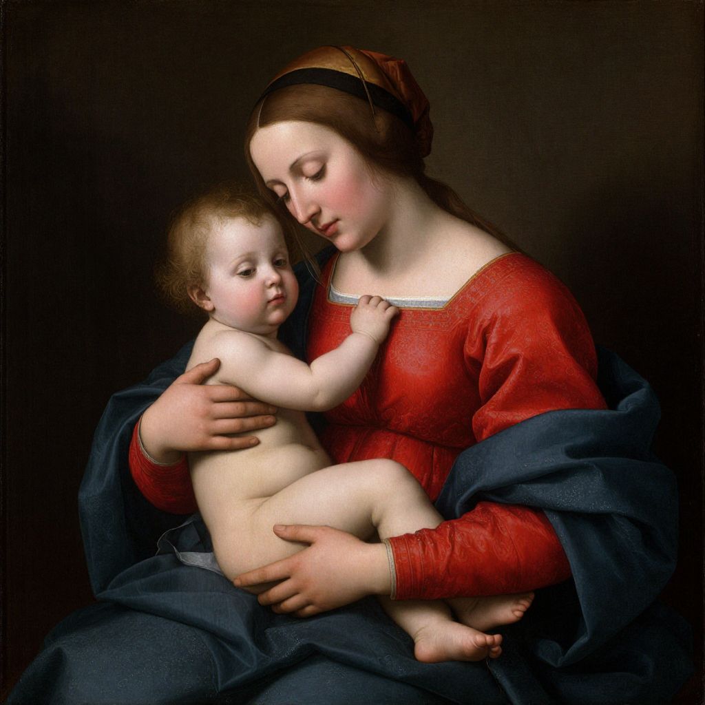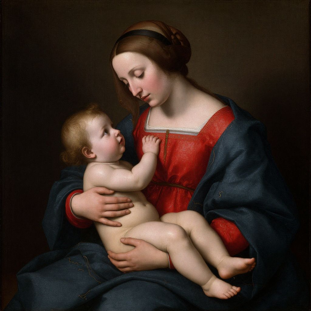 Dirck Bouts' 'Virgin and Child' portrays a tender moment where a woman, draped in vibrant red and dark blue attire, holds a nude infant close, her hands gently cradling the child's body as they share an intimate embrace against a dark, textured background.