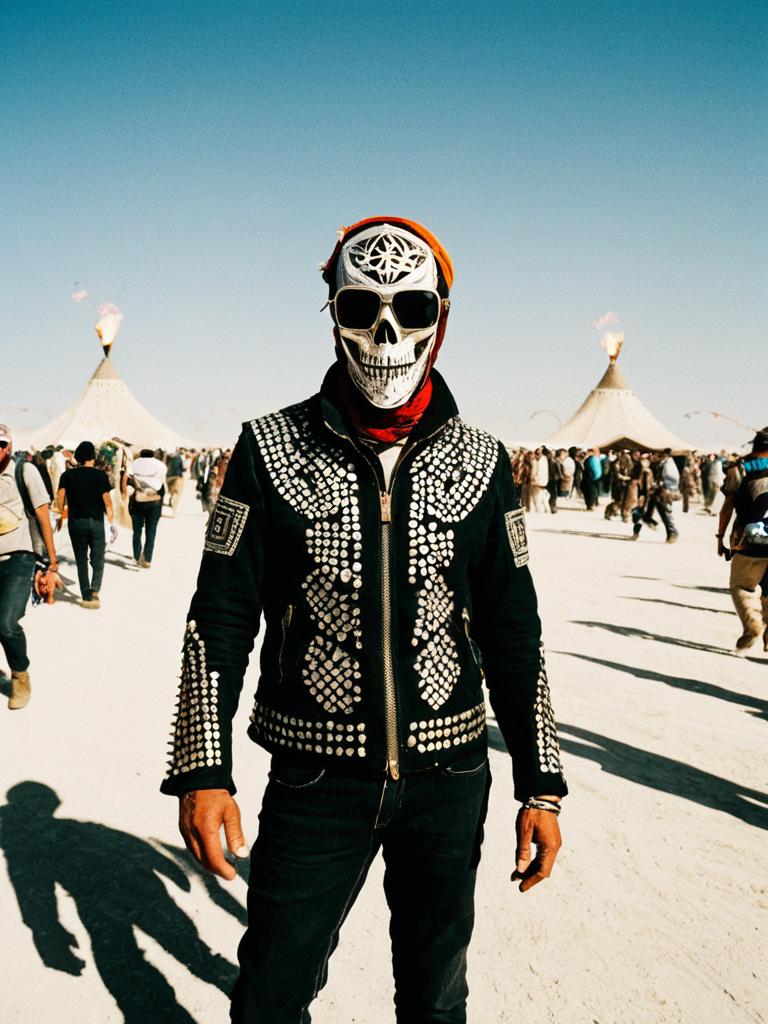 Man in Burning Man outfit, candid photo at outdoor festival, natural daylight