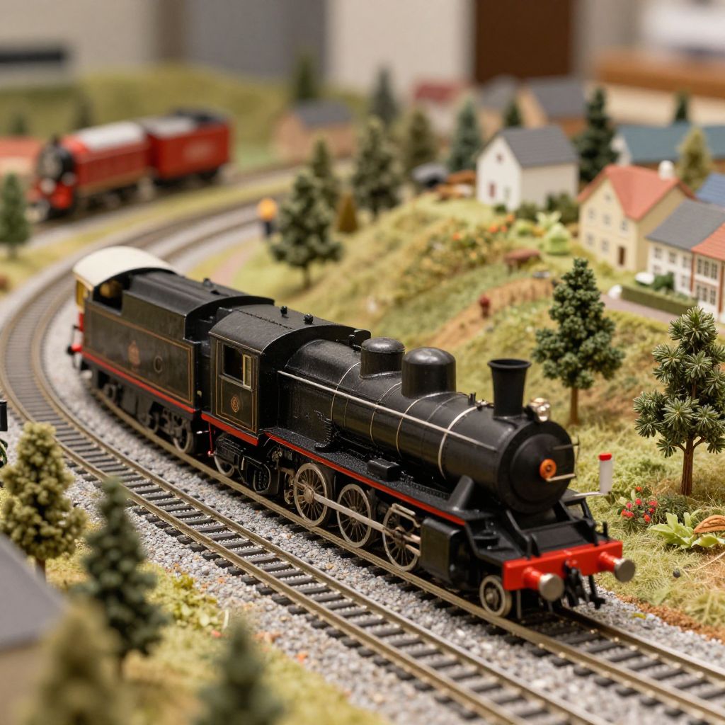 Noch brand model train set with vintage steam locomotive, detailed tracks surrounded by miniature trees and hills, tiny towns in the background, with warm lighting and photorealistic textures emphasizing craftsmanship and hobby culture.