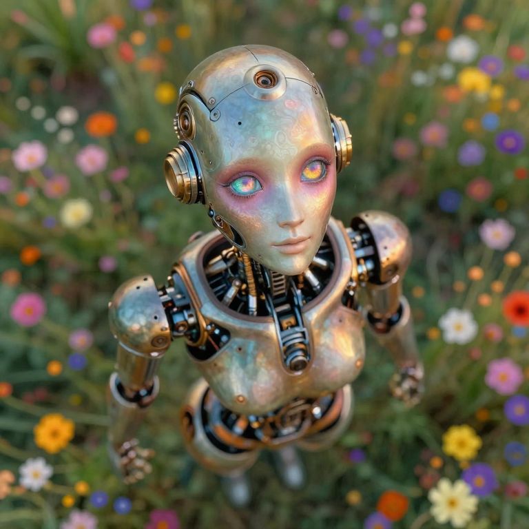 Photograph of a metallic, humanoid robot with a shiny, silver head, large blue and pink glowing eyes, and intricate mechanical joints. The robot stands in a vibrant, colorful meadow filled with blooming flowers in shades of orange, yellow, white, and purple. The robot's face has a gentle, almost innocent expression, and its body is composed of various interconnected metal parts with visible wiring. The background is softly blurred, emphasizing the robot as the focal point. The image has a surreal, slightly dreamlike quality.