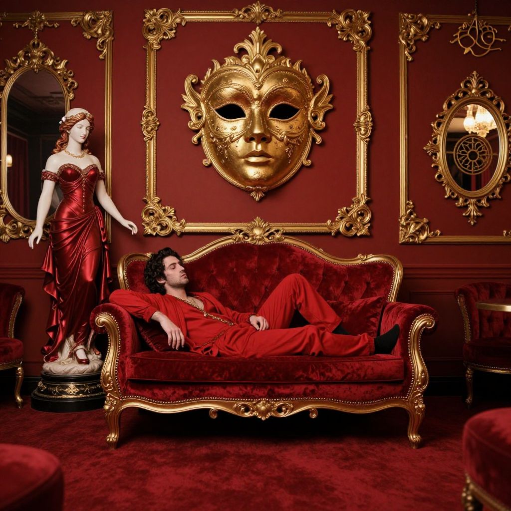 Photograph of an opulent room with rich red decor. A man with dark curly hair, dressed in a red velvet suit, reclines on an ornate gold-framed red velvet sofa. A golden, elaborate mask with a neutral expression hangs on the red wall behind him. To the left, a white statue of a woman in a red, off-the-shoulder dress stands beside a gold-framed mirror. The floor is covered in red velvet, and the walls are adorned with intricate gold trim. The overall style is luxurious and baroque.