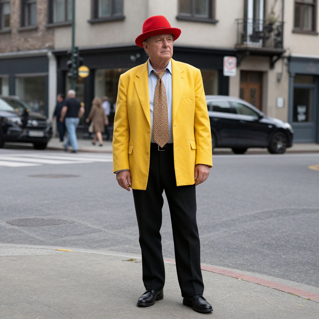 Photograph of an elderly man in a bright yellow jacket, red hat, black pants, and patterned tie, standing on a city street corner.