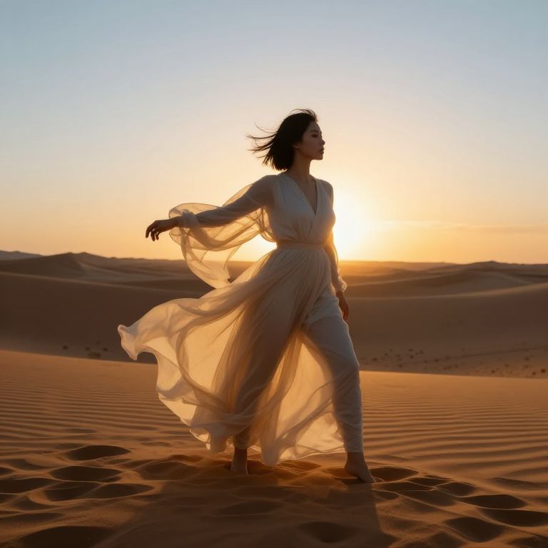 Silhouetted woman in flowing white dress dancing in golden desert sunset, sun behind her, sand dunes in background, sky gradient from blue to