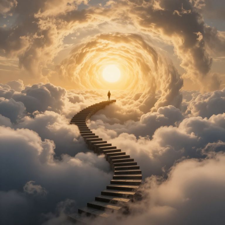 Spiraling stone steps ascend endlessly through concentric rings of swirling clouds, converging toward a radiant golden light at the horizon, where a solitary figure stands silhouetted against the infinite expanse.
