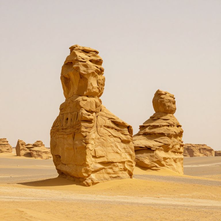 Photograph of a desert landscape featuring two prominent sandstone rock formations. The taller formation stands on the left, with a rugged, layered surface and a slightly rounded top. The shorter formation on the right is similarly textured but more rounded. Both rocks are a warm, golden yellow-brown color, contrasting against the pale, clear sky. The sandy ground is smooth with scattered small rocks. In the background, more distant rock formations are visible, adding depth to the scene. The sunlight casts soft shadows, enhancing the textures of the rock surfaces.