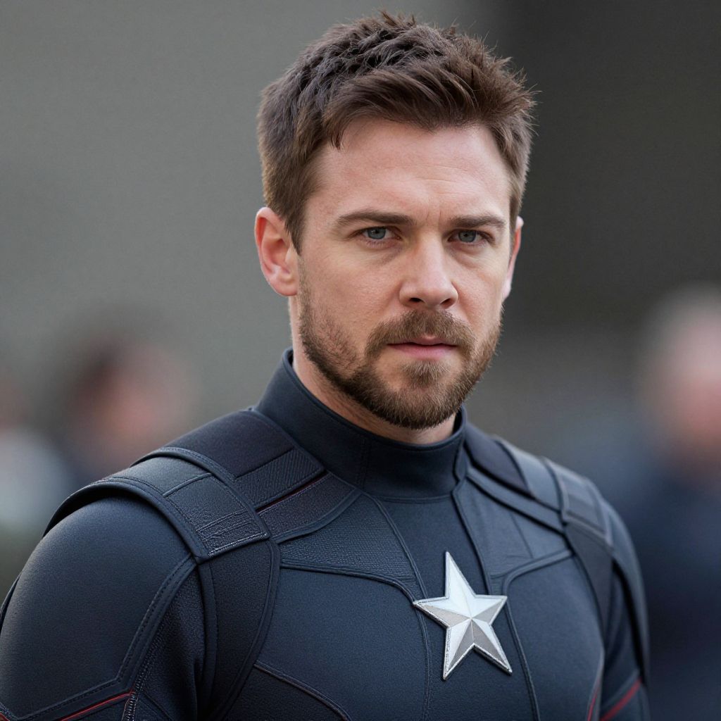 Homemade top gun costume, 1boy, male focus, bulletproof vest, solo, fingerless gloves, gloves, armor, outdoors, pants, belt, shirt, facial hair, blurry background, brown hair, day