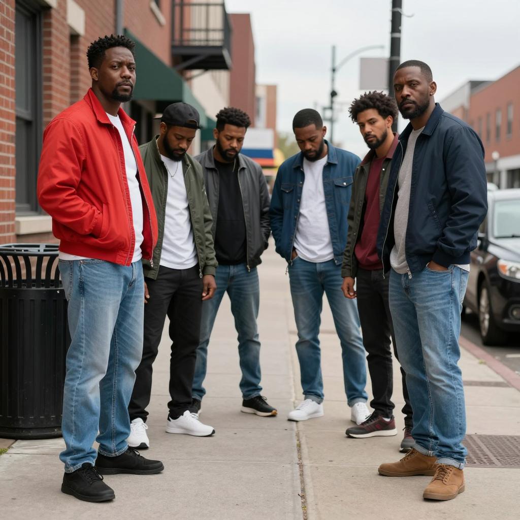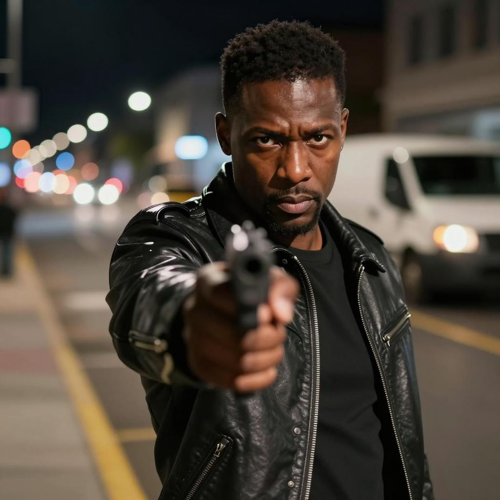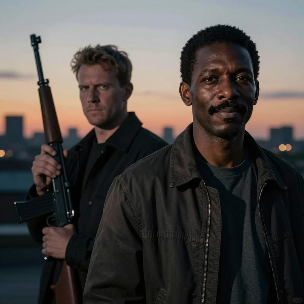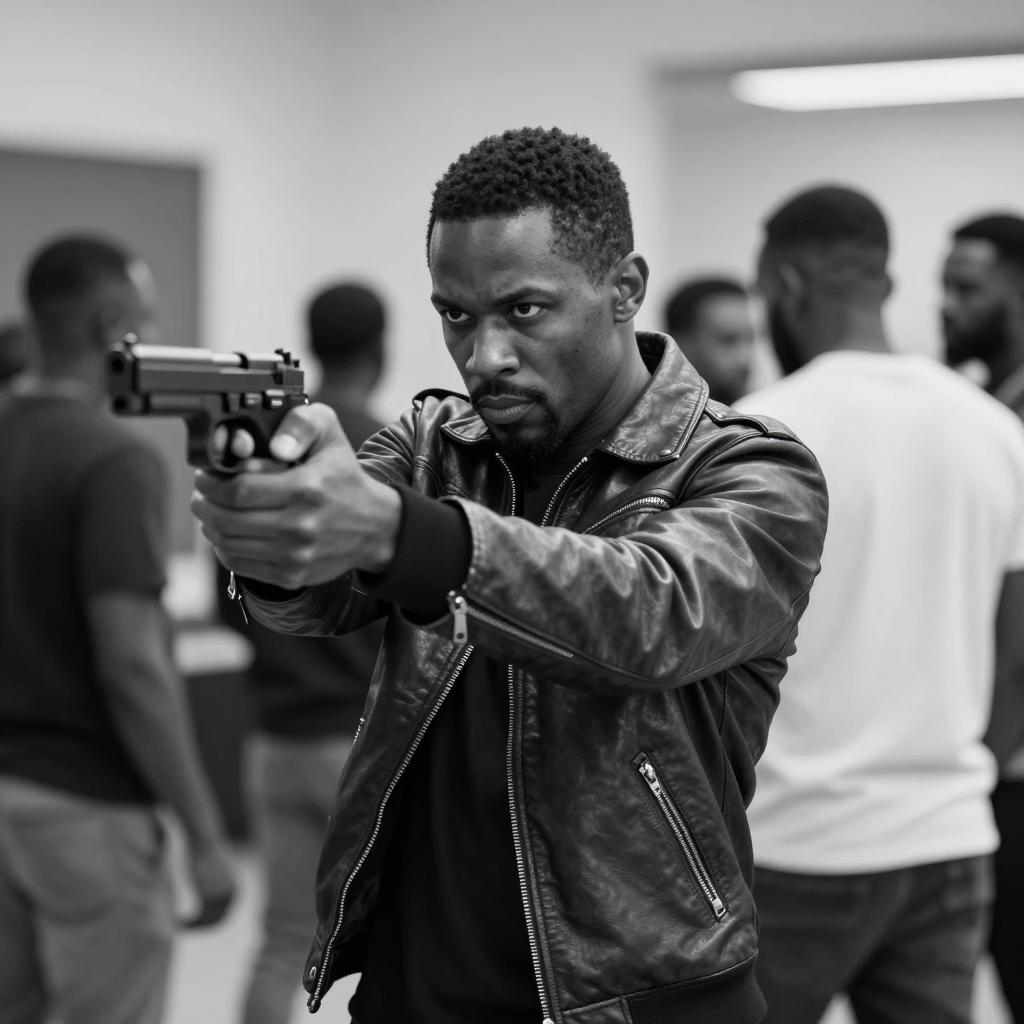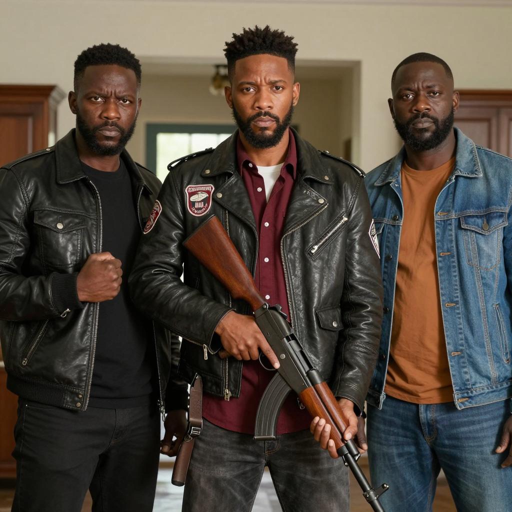 Three black men in an indoor setting. The central man holds a rifle, wearing a decorated leather jacket with patches, red shirt, and serious expression. The man on the left in a black jacket clenches his fist, intense expression. The man on the right in a blue jacket and orange shirt looks forward, slightly out of focus. Background includes a doorway and wooden furniture.