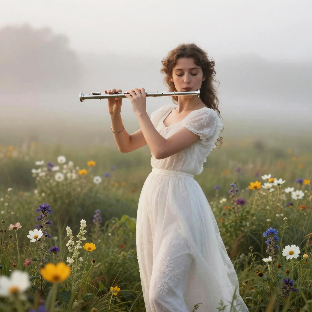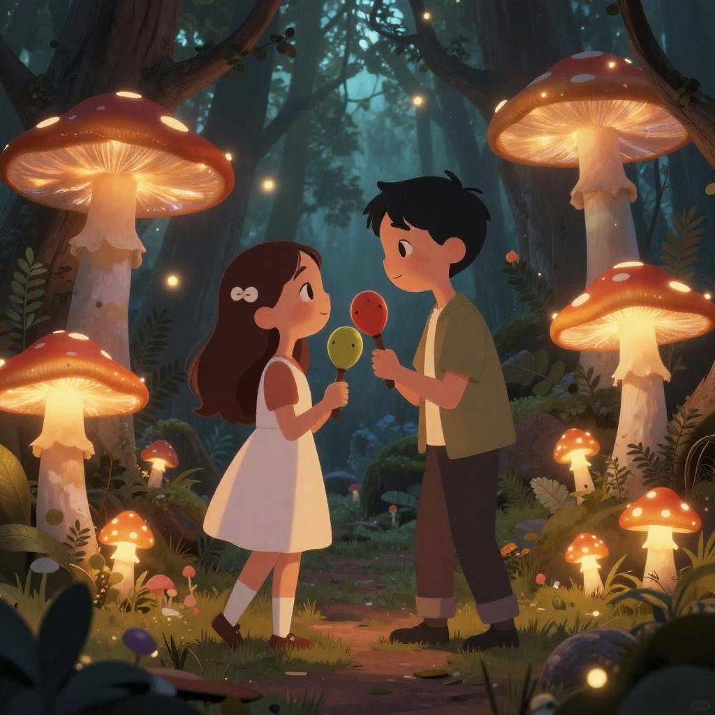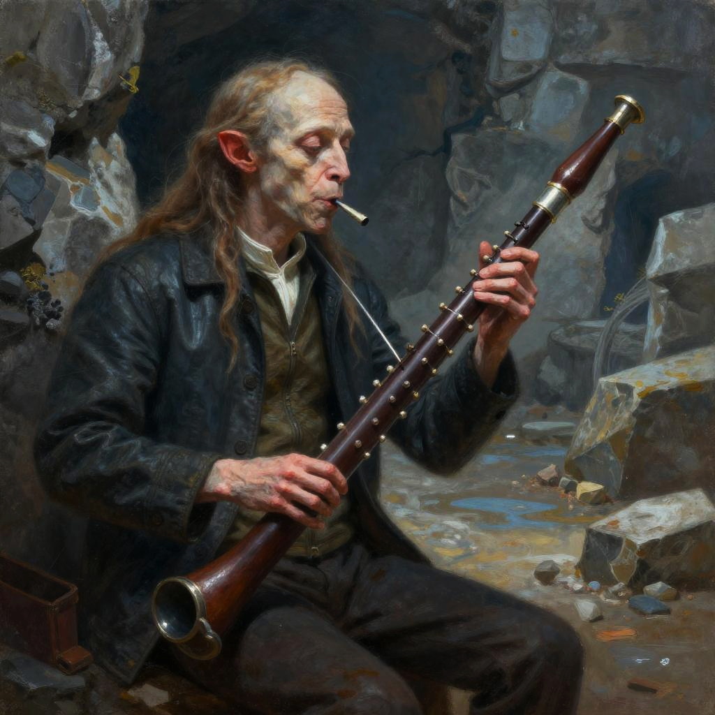 Goblin shaman in love, playing didgeridoo, with shimmering swamp, eerie and enchanted atmosphere, detailed and expressive art