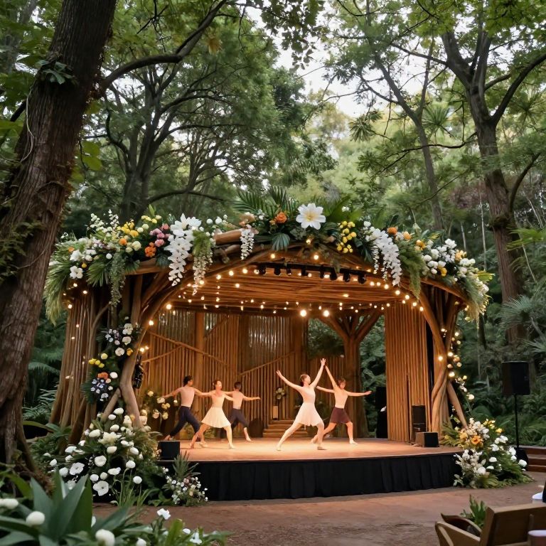 Showstage in an outdoor natural setting surrounded by towering trees and blooming flowers, organic wooden stage design with fairy lights, dancers performing contemporary choreography, soft natural light filtering through foliage, peaceful and magical vibe.