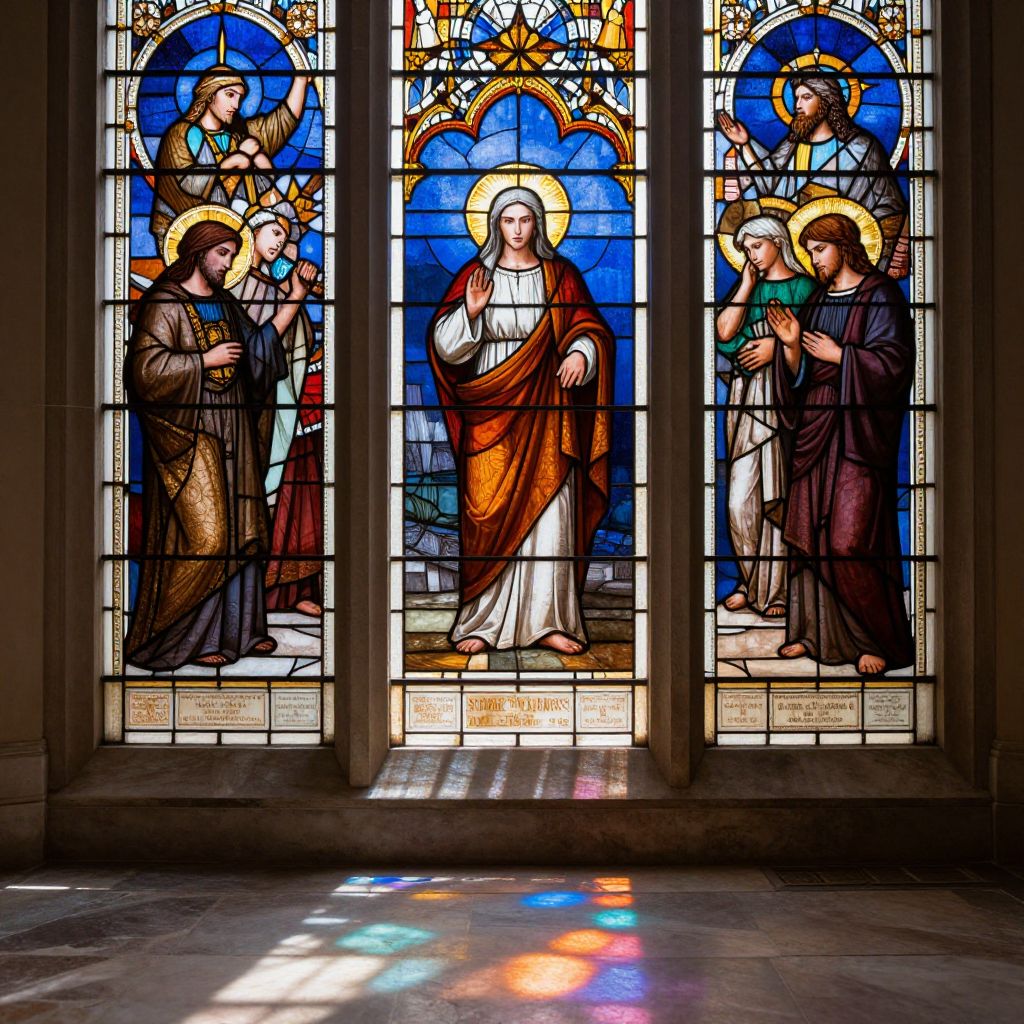 Faiths visualized as an intricate stained glass window featuring symbolic motifs from multiple religions, radiant sunlight streaming through, casting colorful reflections on an old stone floor, evoking reverence, unity, and shared human belief.