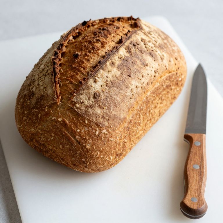 Photograph of a crusty, brown bread loaf with textured surface, next to a wooden-handled kitchen knife on a white surface.