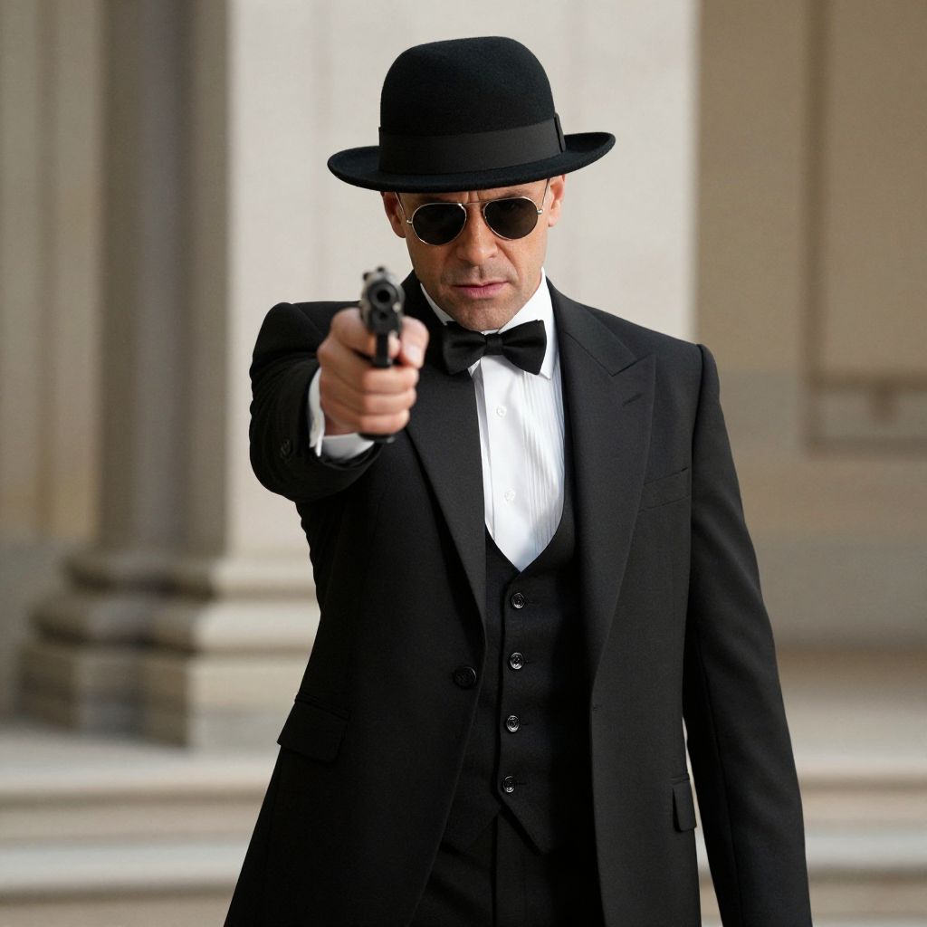 Photograph of a suave, middle-aged man in a black tuxedo, complete with a bow tie, white dress shirt, and black fedora. He wears round, dark sunglasses and points a black handgun directly at the camera. His expression is serious and focused. The background features an out-of-focus, grandiose architectural setting with columns and light-colored walls. The lighting is natural, highlighting the man's formal attire and intense demeanor. The overall style blends classic elegance with a dramatic, action-oriented theme.
