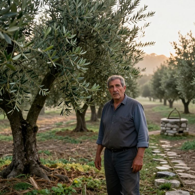 A serene morning in a quiet olive grove, soft sunlight filtering through the tall olive trees, with a detailed, middle-aged farmer with kind eyes and weathered hands standing near a row of mature olive trees, dew on the leaves, background showing rustic stone pathways and a small stone well in the distance.