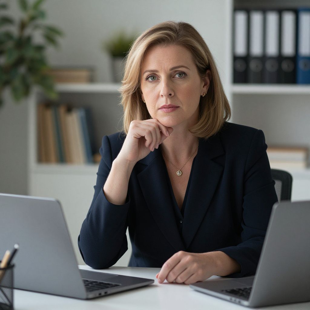 Photograph of a focused, blonde, middle-aged woman in a black blazer, sitting at a desk with two laptops, in a modern office with