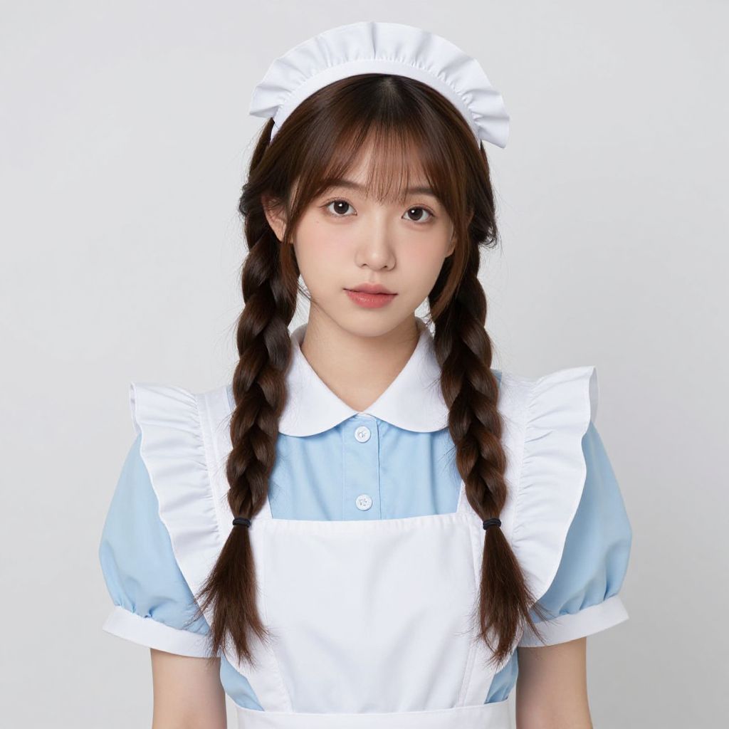 Female with braids in her hair, wearing a red and white checkered dress with a green apron and green shorts.