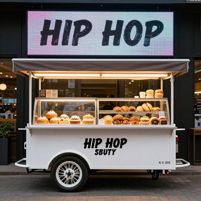 Raw Format A food cart that sells bakery goods styled logo hip hop theme - portable cart wide with a led screen in hte background that shows a menu,